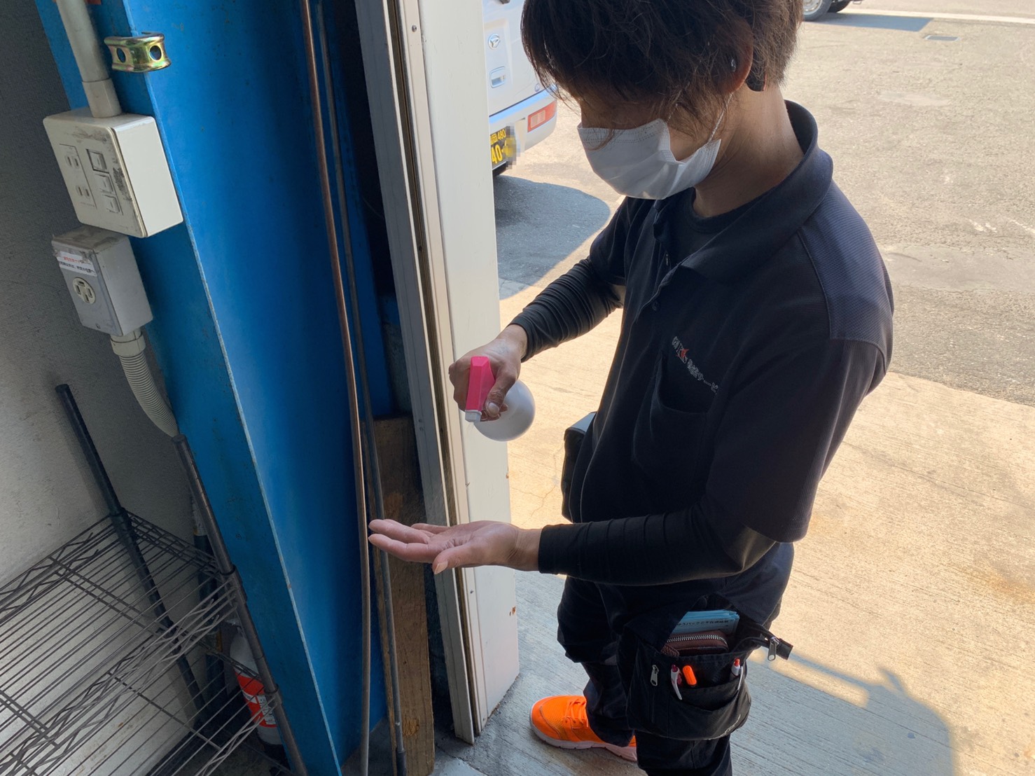 倉庫内に入る際に入口に設置している次亜塩素酸水にて除菌をしてます。