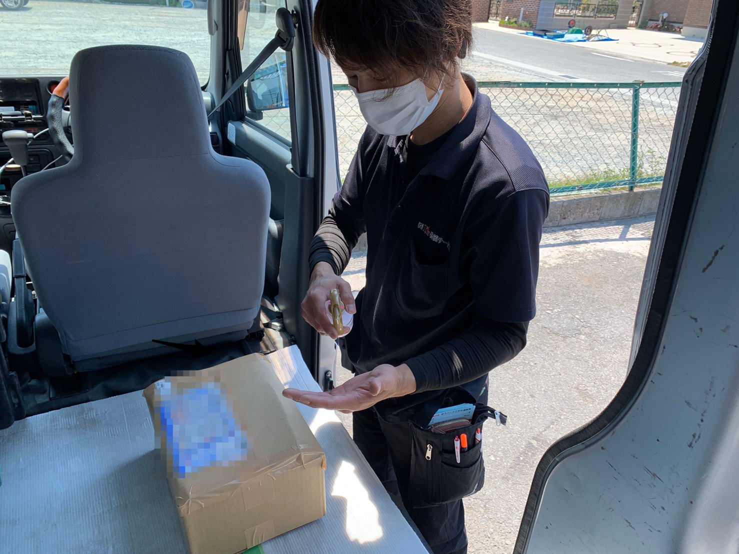 配送完了後、車内に戻って除菌をして次の配送現場へ
