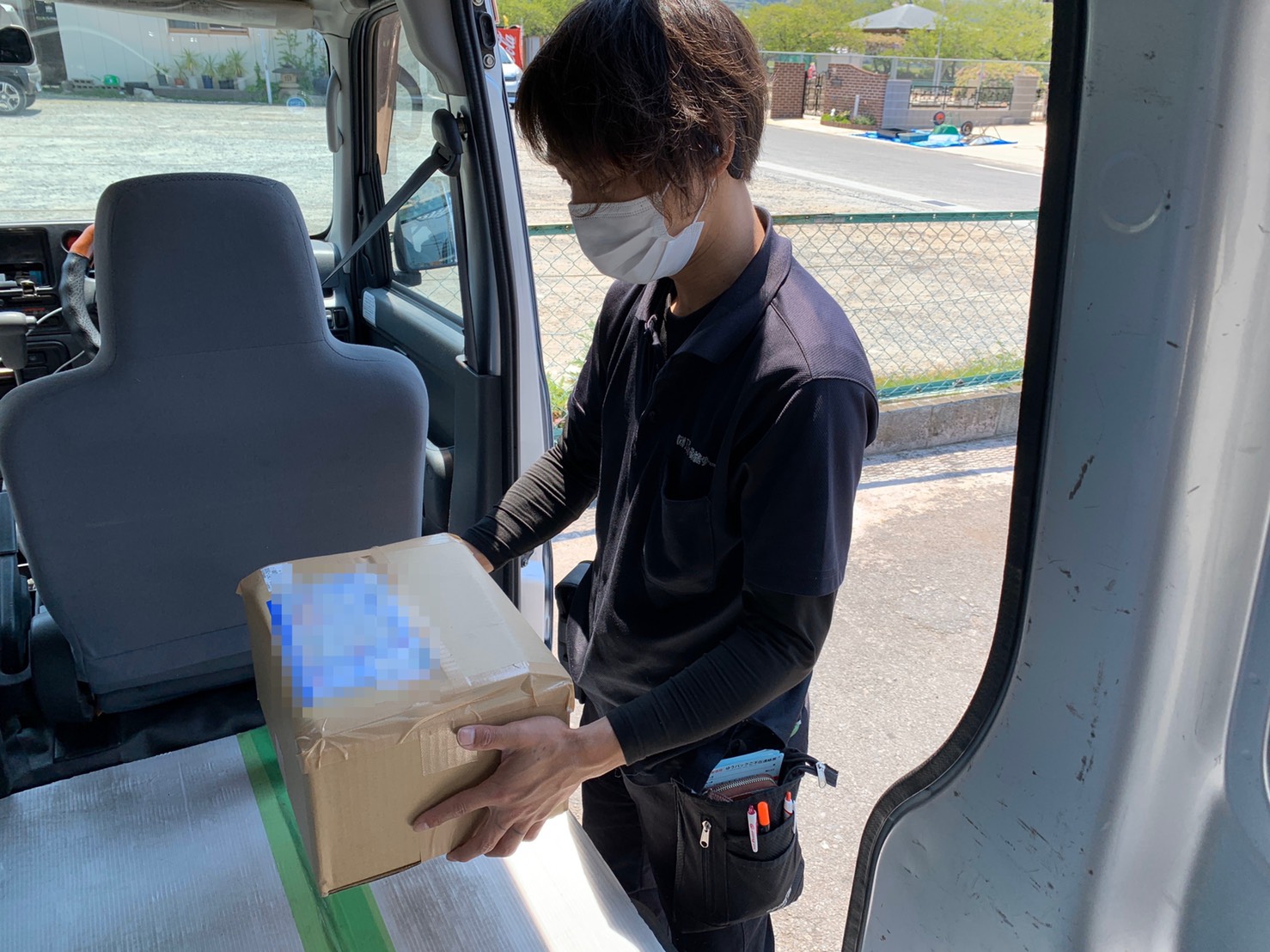 マスクの着用と次亜塩素酸水を常備し配送を行っております。